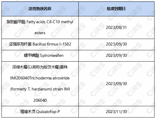 以下5个活性物质的申请已到期,相关产品未来已经/马上将在欧盟市场被淘汰。