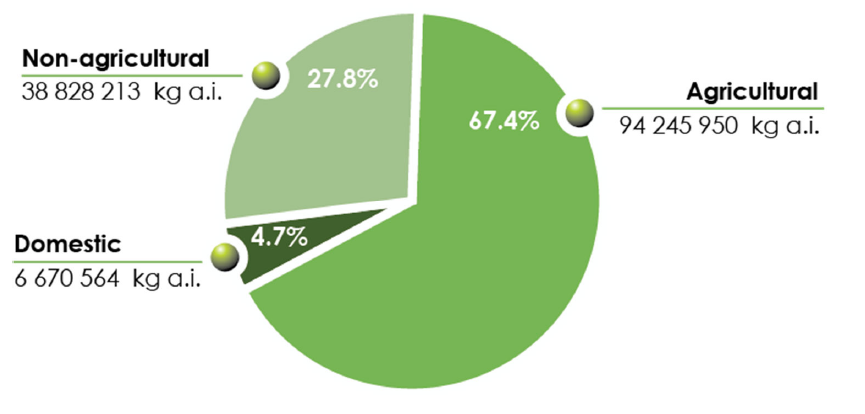加拿大农药产品按用途分为三类:农用、非农用、家用。2022年,农用产品占总销量的67.4%(图3)、非农用占27.8%、家用占4.7%。与2021年相比,农用产品占比从72.3%降至67.4%,非农用占比从21%升至27.8%,家用占比从7%降至5%(图2)。