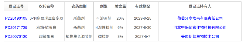 经查询,已有3个蛋白类农药在我国取得登记,包括美国伊甸生物技术公司的超敏蛋白。