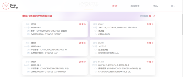 在我国多个香茅和香茅提取物已列入中国已使用化妆品原料目录,可以作为化妆品原料正常使用,同时化妆品安全技术规范并未对其含量做出明确限制。另外香茅油的主要成分香茅醇、香茅醛在我国均是已批准的食品添加剂。