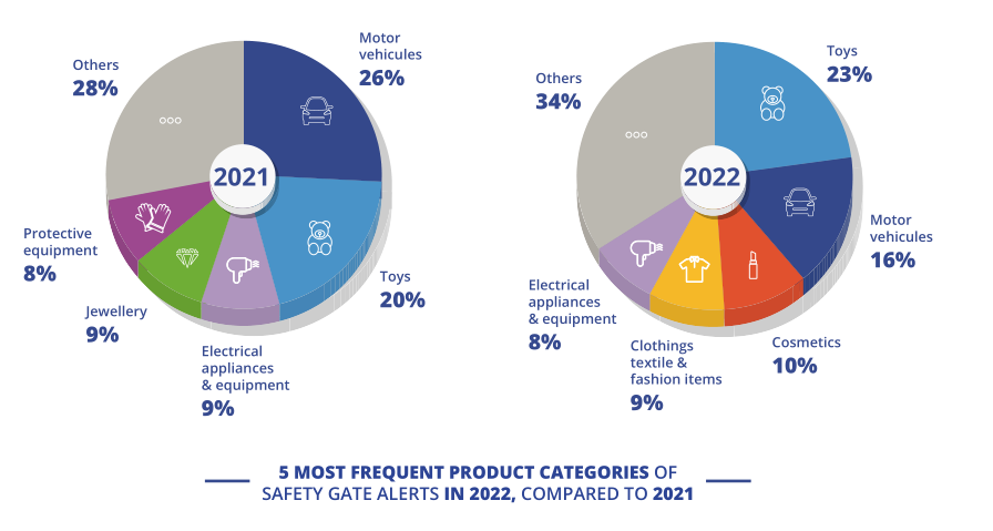 2022年通报最多的与化学物质、伤害和窒息风险相关。最常见的通报产品类别中玩具列居首位,其次是机动车,化妆品、服装和电器。与香水中存在被禁止的化学物质有关的化妆品警报数量显著增加(例如丁基苯基甲基丙醛BMHCA和羟基异己基3-环己烯甲醛HICC)。