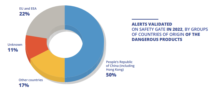 自2006年以来,欧盟委员会一直与负责市场监管中国政府密切合作。政府机构追踪危险品的中国生产者和出口商,确保采取适当改进措施。为此,专门建立了一个中欧“安全门”平台。2022年半数安全门警报产品来自中国。