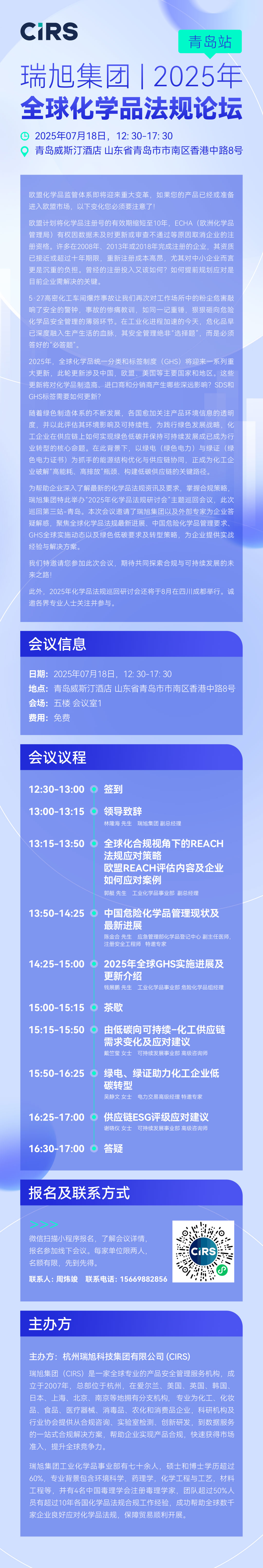 此外,2025年化学品法规巡回研讨会还将于8月在四川成都举行。诚邀各界专业人士关注并参与。