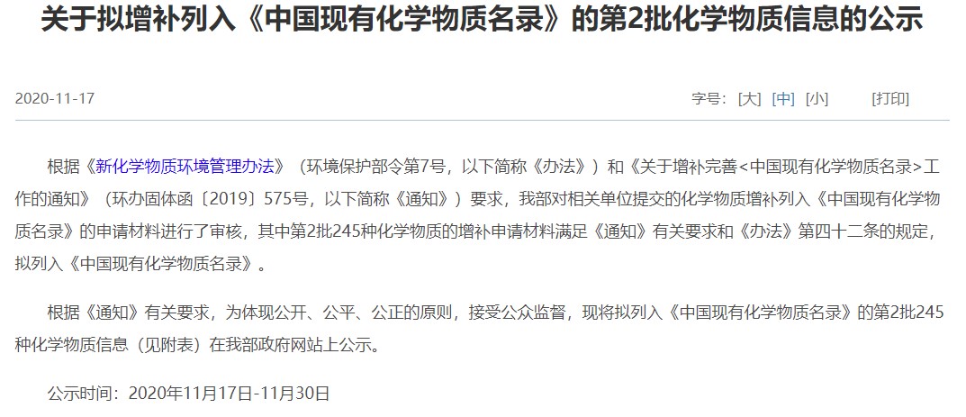 2020年11月17日,生态环境部发布了《关于拟增补列入<中国现有化学物质名录>的第2批化学物质信息的公示》,经审核,共245种化学物质的增补申请材料符合相关要求和规定,拟列入《名录》。