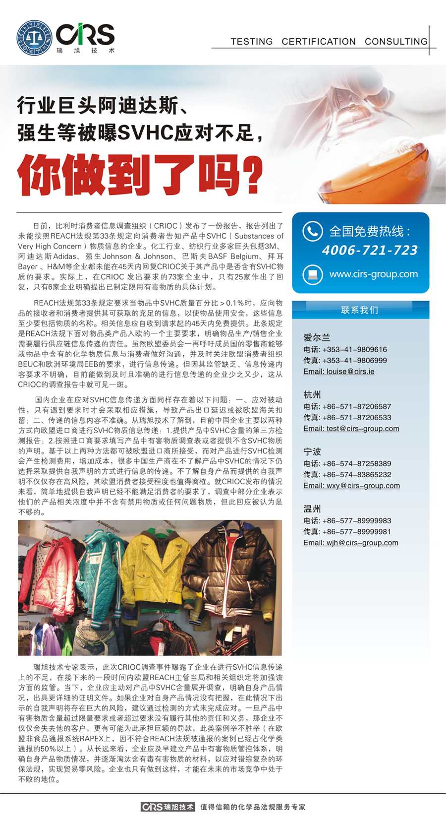 德国推出消费者“SVHC通报信息要求“条形码服务,一方面宣传了消费者有获知产品中SVHC信息的权力,帮助推广了这类需求,以民众的查询手段辅助进行REACH法规中对SVHC物质的监管;另外一方面,物品的进口商或制造商需要及时应对来自消费者的查询请求,使产品中含有的SVHC更透明化。这就要求企业时刻保持警醒的意识,努力完成供应链信息传递的义务。