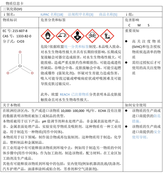 其中,最引人注目的变化就是出现了信息卡。信息卡简明扼要的提供了物质的关键信息。ECHA注册部Christel Musset 女士表示:“使用者将能更快了解物质的关键特性,包括分类信息,是否属于危险类。对于有危险特性的物质,信息卡上也将呈现对该物质的相关监管信息。这对于工人、下游使用者和普通公民来说,都是非常有用的。”
