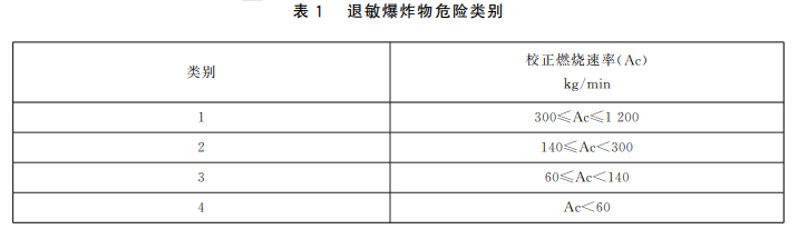 退敏爆炸物按供货和使用要求包装后,按照 GB/T14372—2024的燃烧速率试验得到校正燃烧速率,分为四个危险类别。