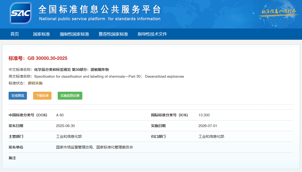 近日,全国标准信息公共服务平台正式公开了GB30000.30-2025《化学品分类和标签规范 第30部分:退敏爆炸物》全文。该标准将于2026年7月1日正式实施,标志着我国在化学品危险分类领域实现与国际标准的深度衔接。