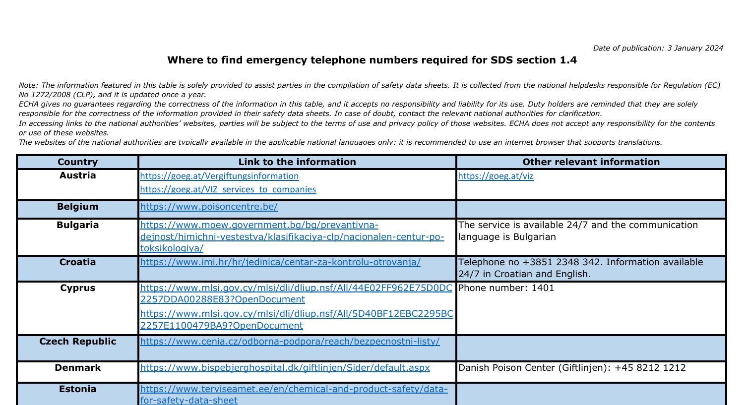- 如果欧盟成员国存在官方应急咨询机构(根据法规(EC) No 1272/2008第45条所述),则SDS上必须提供其电话号码,并注明以下限制(如有):服务时间(如仅限办公时间、具体时段);信息类型限制(如仅限医疗人员使用);需提前与机构确认号码可公开及附加条件(如提交SDS副本)。
