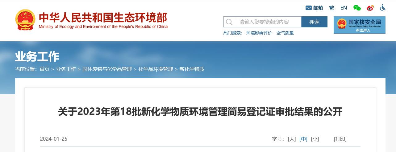 - 生态环境部发布关于2023年第6批新化学物质环境管理简易登记证审批结果
