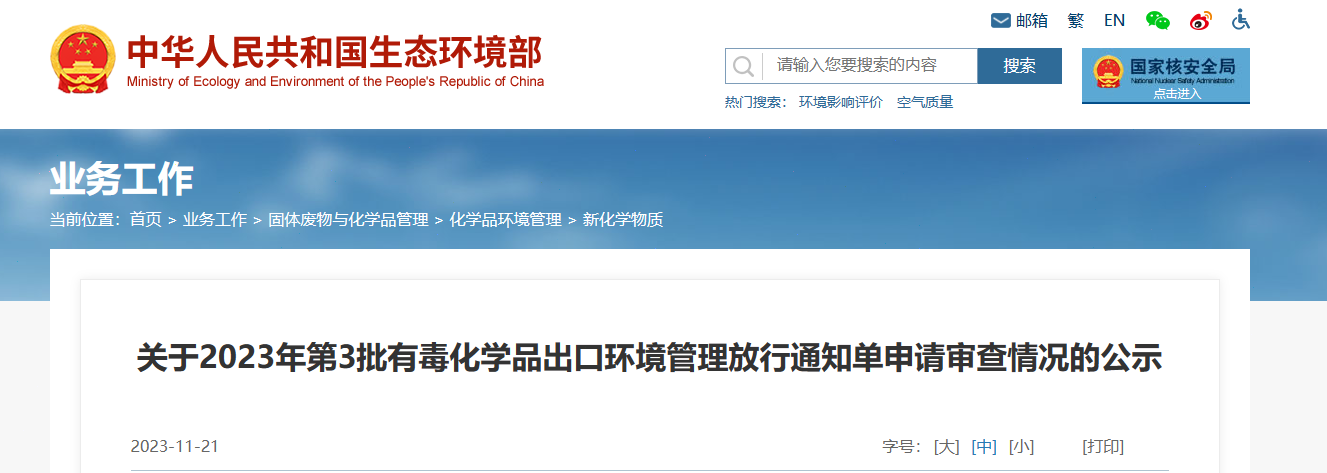 2023年11月21日,生态环境部发布了关于2023年第3批有毒化学品出口环境管理放行通知单申请审查情况的公示,具体内容如下: