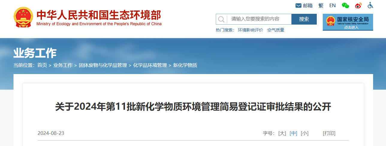 按照《中华人民共和国政府信息公开条例》(国务院令第711号)的要求,现将2024年第11批新化学物质环境管理简易登记证审批结果予以公开。