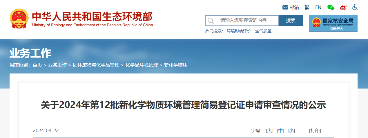 根据《办法》第二十四条,现将拟批准的新化学物质环境管理简易登记证申请相关情况予以公示。