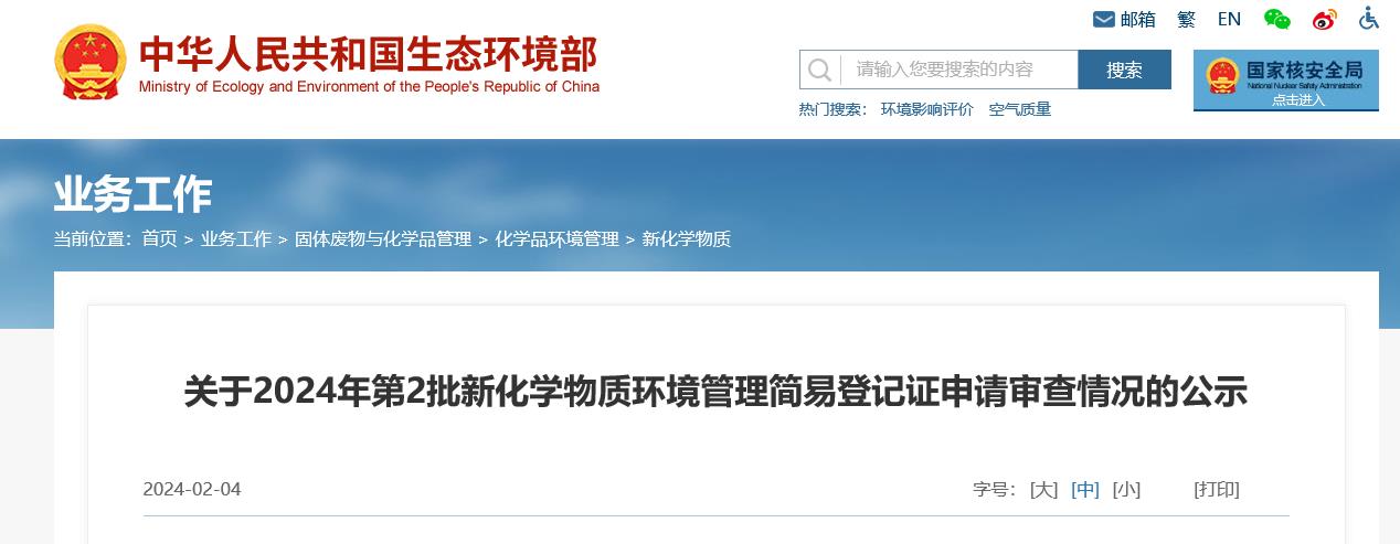 - 生态环境部发布关于2023年第6批新化学物质环境管理简易登记证审批结果