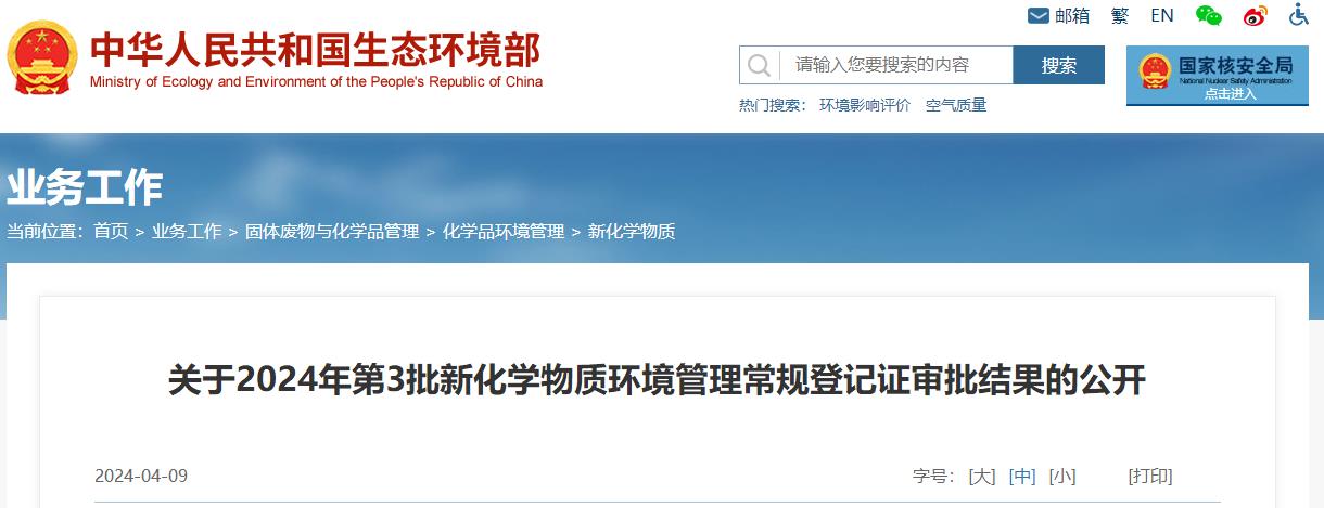 按照《中华人民共和国政府信息公开条例》(国务院令第711号)的要求,现将2024年第3批新化学物质环境管理常规登记证审批结果予以公开。
