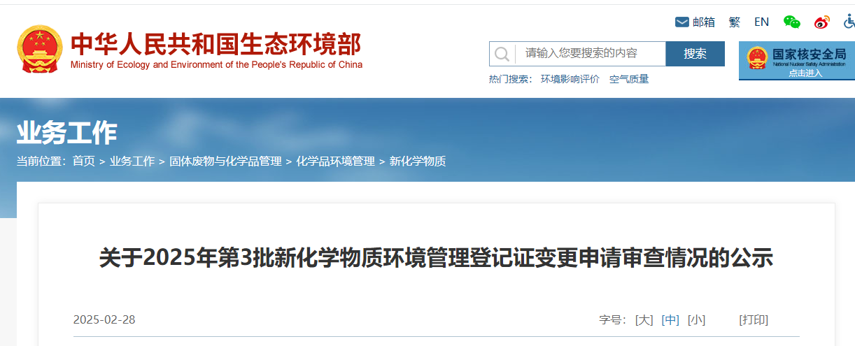 根据《办法》第三十条,现将拟批准的新化学物质环境管理登记证变更申请相关情况予以公示。
