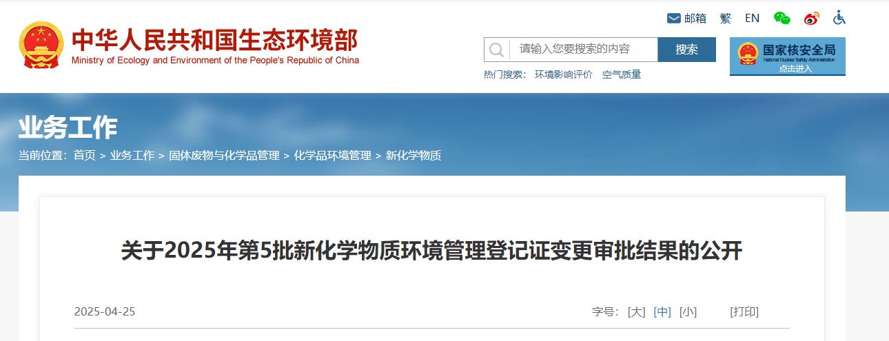 按照《中华人民共和国政府信息公开条例》(国务院令第711号)的要求,现将2025年第5批新化学物质环境管理登记证变更审批结果予以公开。
