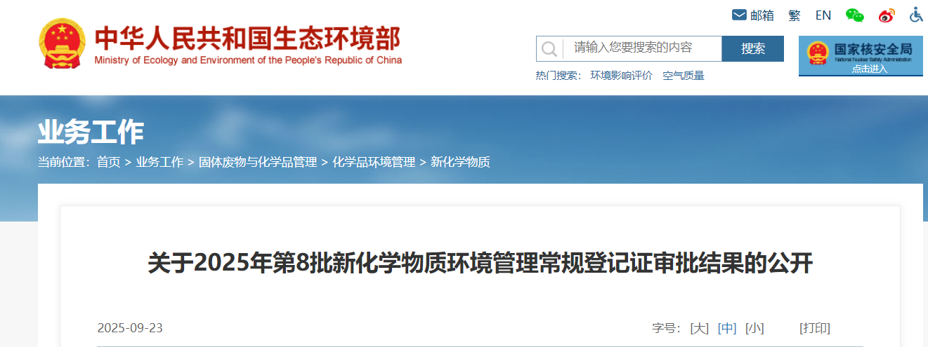 按照《中华人民共和国政府信息公开条例》(国务院令第711号)的要求,现将2025年第8批新化学物质环境管理常规登记证审批结果予以公开。