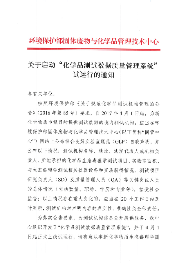 关于启动“化学品测试数据质量管理系统”试运行的通知