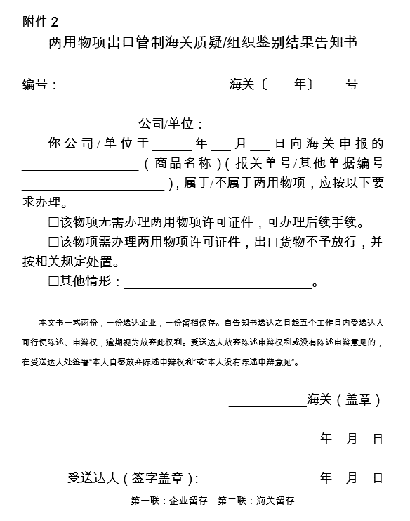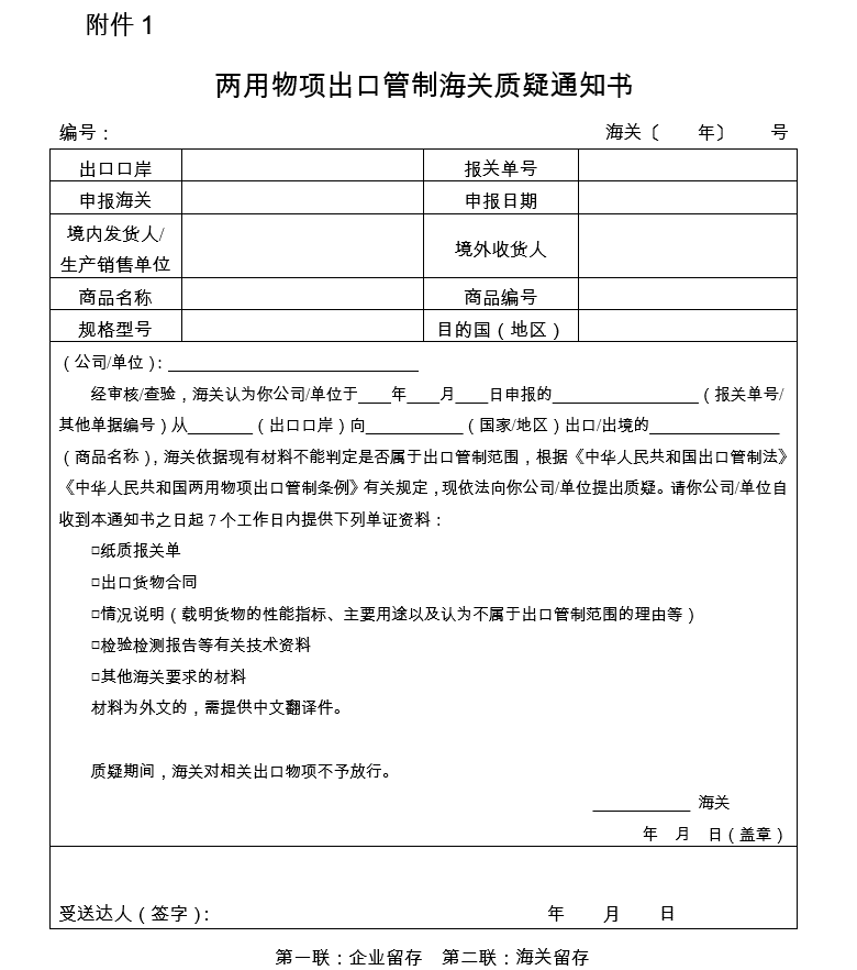 出口货物发货人未向海关交验国家出口管制管理部门许可证件,且海关有证据表明货物可能属出口管制范围的,海关应当向发货人提出质疑,并制发《两用物项出口管制海关质疑通知书》(附件1)。