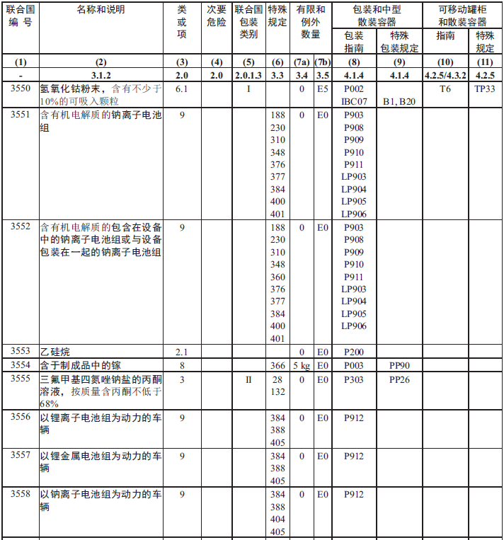 UN3552与设备包装在一起的钠离子电池,含有机电解质 | UN3552 Sodium ion batteries packed with equipment with organic electrolyte |
