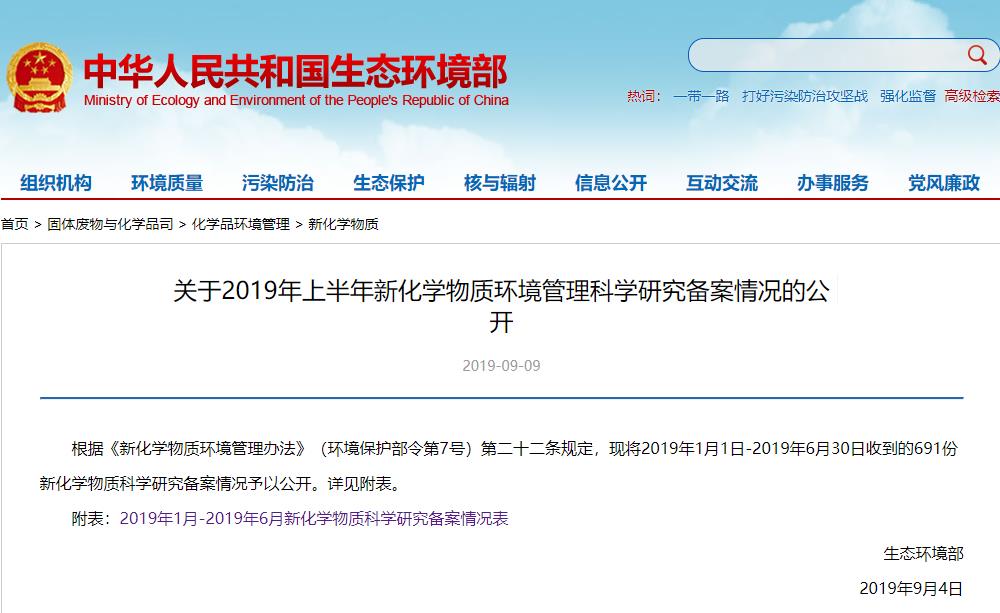 环保部发布关于2019年上半年新化学物质环境管理科学研究备案情况