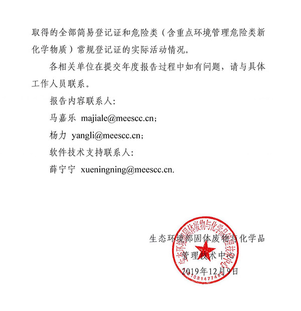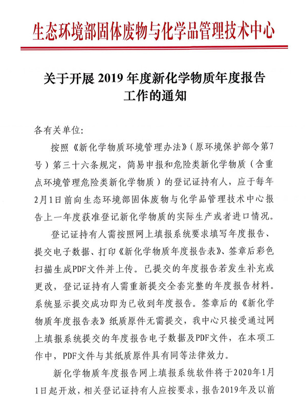 2019年12月13日,环保部发布关于开展2019年度新化学物质年度报告工作的通知。按照《新化学物质环境管理办法》(环境保护部令第7号)第三十六条规定,简易申报和危险类新化学物质(含重点环境管理危险类新化学物质)的登记持证人,应于每年2月1日前向环境保护部固体废物与化学品管理技术中心报告上一年度获准登记新化学物质的实际生产或者进口情况。