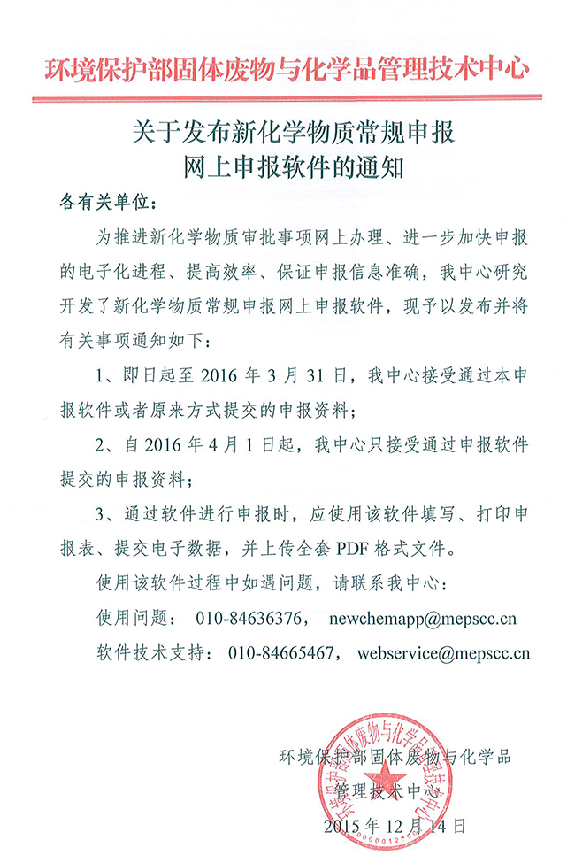 为推进新化学物质审批事项网上办理、进一步加快申报的电子化进程、提高效率、保证申报信息准确,环保部固体废物与化学品管理技术中心研究开发了新化学物质常规申报网上申报软件,现予以发布。