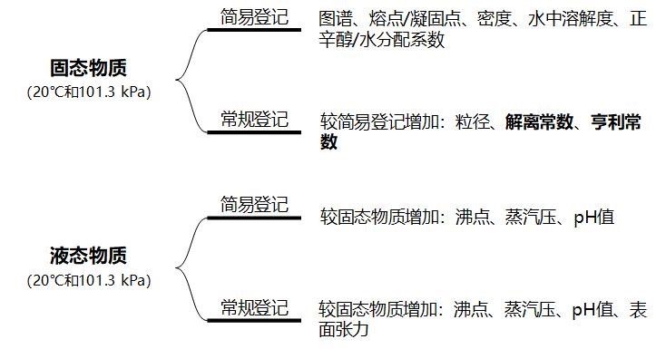 根据申请物质在常温常压下(20℃和101.3 kPa)的物理状态,提交所申请新化学物质理化性质数据,理化性质全部作为基本数据提交,具体要求见下图。