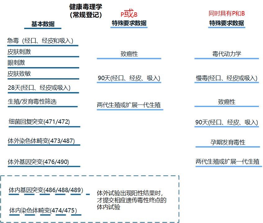 若具有P或B则应进一步提交健康毒理学特殊要求数据,包括90天反复染毒毒性、生殖/发育毒性、毒代动力学、慢性毒性和致癌性。
