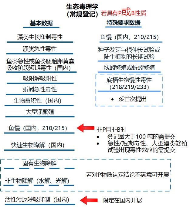 常规登记生态毒理基本要求数据包括:藻类生长抑制、溞类急性、鱼类急性或鱼类胚胎-卵黄囊吸收阶段短期毒性、活性污泥呼吸抑制、吸附解吸附、降解性、蚯蚓急性毒性、大型溞繁殖、生物累积性和鱼类慢性毒性试验。对于具有P或B性质的物质,需提交生态毒理学特殊要求数据,包括:种子发芽和根伸长试验或陆生植物生长试验、线蚓繁殖试验或蚯蚓繁殖试验和底栖生物慢性毒性试验。