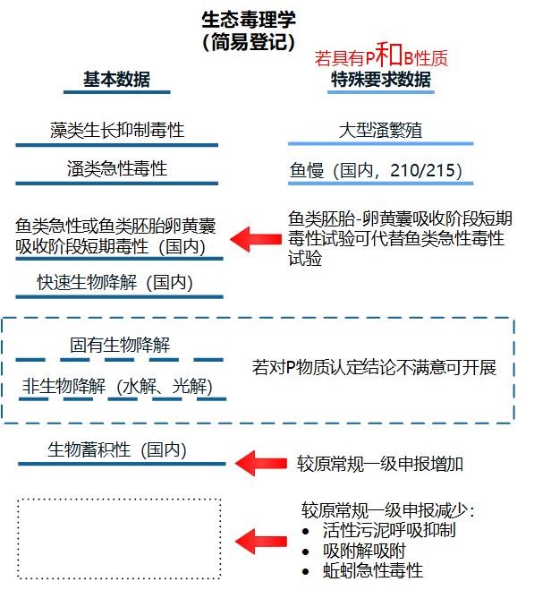 简易登记生态毒理学基本数据包括:藻类生长抑制、溞类急性、鱼类急性或鱼类胚胎-卵黄囊吸收阶段短期毒性、降解性和生物累积性。对于同时具有P和B物质,需提交生态毒理学特殊要求数据,包括:大溞繁殖和鱼类慢性。