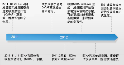 该草案于2011.10.22提交给成员国和成员国委员会。委员会将在2012.2月份对草案做出的修正意见。ECHA将根据修正意见制定最终的CoRAP 欧盟滚动计划。2012年2月底达成最终的CoRAP的滚动计划并发布在ECHA的官网上。各成员国有一年的时间评估物质,特别是对2012年需要评估的物质。成员国拟定一个决议草案,在CoRAP评估物质清单最终确定之前,注册者将有机会对提供新数据的要求发表意见。决议草案经其他成员国和ECHA审查后,给出修订建议,修订建议经欧盟成员国委员会同意后生效。下图是CoRAP的时间图。