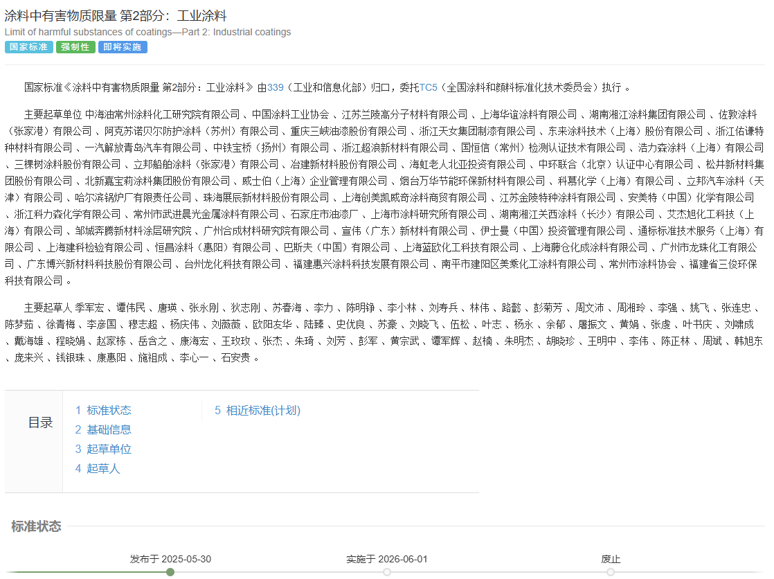 2025年5月30日,国家市场监督管理总局及国家标准化管理委员会联合发布了两项强制性国家标准《涂料中有害物质限量 第1部分:建筑涂料》(GB 30981.1-2025)和《涂料中有害物质限量 第2部分:工业涂料》(GB 30981.2-2025),将于2026年6月1日正式实施。此举标志着我国对建筑及工业涂料中有害物质的管控进入更精准、更严格的新阶段,旨在保障消费者健康,推动行业绿色高质量发展,助力环境污染防治。