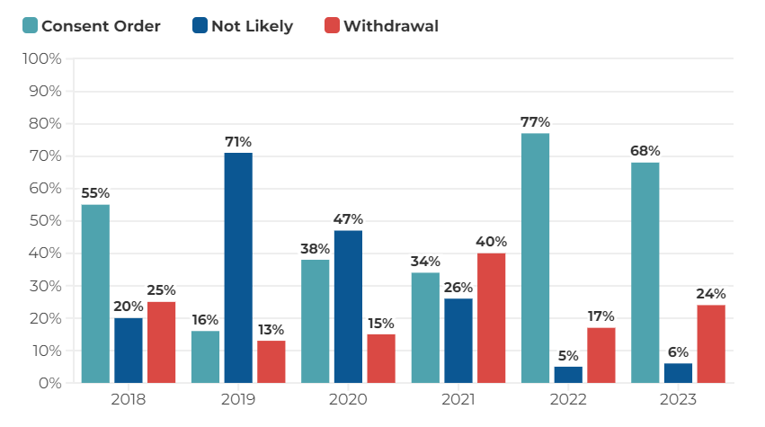 撤回的数量有所增加,从2016年的平均约5%增加到2021年的19%。在2021年和2022年,大约40%的豁免要么被撤回要么被拒绝