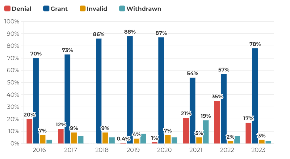 在2021年之前,拒绝的数量呈下降趋势,而豁免的授予数量有所增加。2021年拒绝的比例急剧增加到21%,2022年进一步增加到35%。