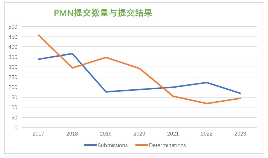 从2021年到2022年, PMN决定的类型发生了显著变化。自2017年以来,同意令的数量一直在下降,2020年是个例外,当年因光刻应用完成了20多个同意令,以及为油气井使用的15种化学品的合并提交。