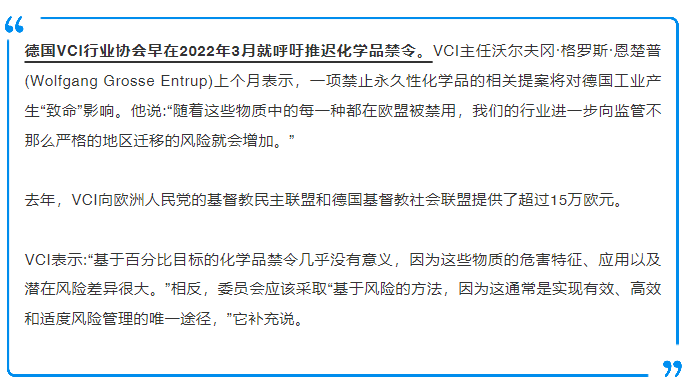 德国VCI行业协会早在2022年3月就呼吁推迟化学品禁令。VCI主任沃尔夫冈·格罗斯·恩楚普(Wolfgang Grosse Entrup)上个月表示,一项禁止永久性化学品的相关提案将对德国工业产生“致命”影响。他说:“随着这些物质中的每一种都在欧盟被禁用,我们的行业进一步向监管不那么严格的地区迁移的风险就会增加。”