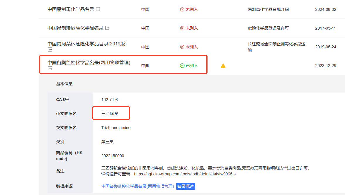- 经查询,发现三乙醇胺列入了中国监控化学品名录(两用物项管理),点击合规信息后,发现三乙醇胺含量较低的非医用消毒剂、合成洗涤粉、化妆品、墨水等消费类商品,无需办理两用物项和技术进出口许可。