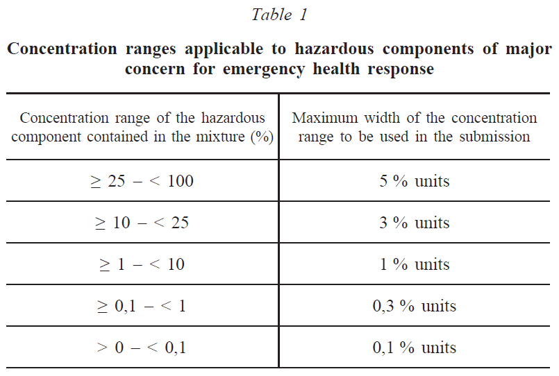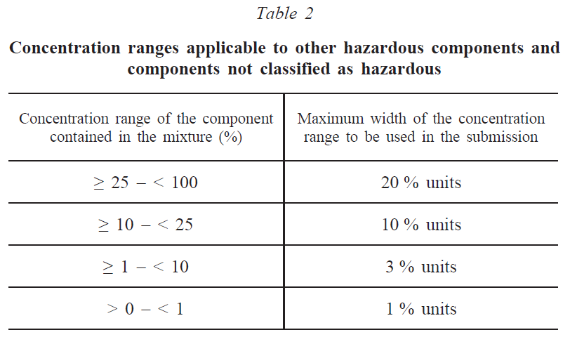 4. 混合物组分如果用浓度范围表示,需要符合法规的规定。关于浓度范围的填写,CLP法规中针对PCN提交给出了比SDS编制时更严格的要求,相关要求如下: