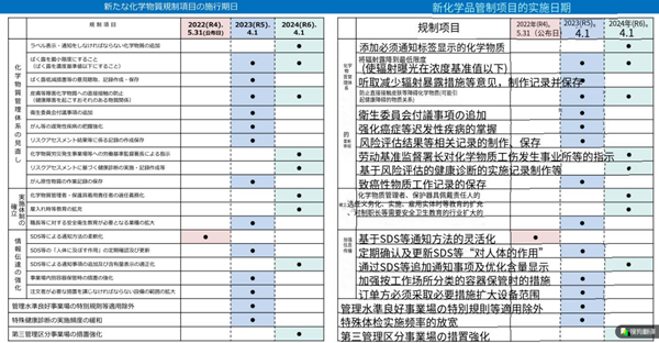 1. 通过通知和风险评估义务的物质(风险评估对象),根据国家的GHS分类确认危险性和有害性的所有物质依次追加。2022年2月颁布的“劳动安全卫生法实施令”《安卫法》修订,在国家GHS分类的结果中,在致癌性、生殖细胞致突变性、生殖毒性、急性毒性类别中确认了比较强的234种有害性物质被添加到了标签标识等义务对象中。然而,截至2024年4月1日,至2025年3月31日为止,《安卫法》第57条第1款的标签标识义务的规定不适用。今后的标签和SDS义务对象的追加候补物质,在劳动者健康安全机构劳动安全卫生综合研究所化学物质信息管理研究中心的网站上附有CAS登记号公开。