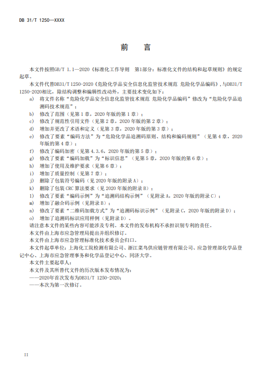 2024年12月31日,上海市市场监督管理局发布关于对《危险化学品追溯码技术规范》地方标准公开征求意见的通知,就《危险化学品追溯码技术规范(送审稿)》公开征求意见,意见征集截止期至2025年1月31日。