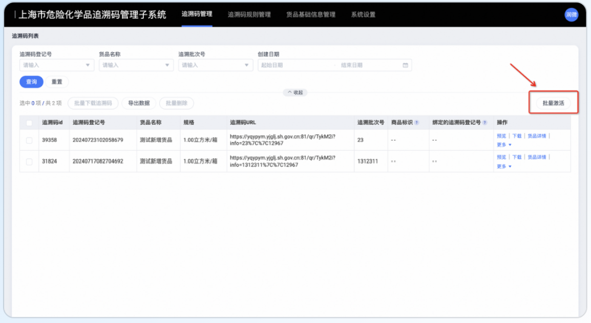 上海管局的免费追溯码平台将新增追溯码批量激活功能。企业 SAP、WMS、ERP 等系统可以通过内部物料id和批次号,根据规则自动生成URL,然后将内部物料id、批次和生成的url复制粘贴到激活窗口完成危险化学品追溯码的批量激活。