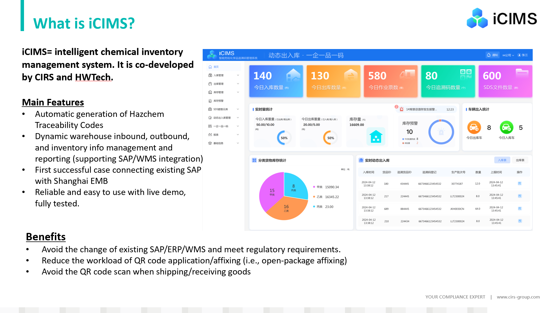 由瑞旭集团和沪万智能联合研发的iCIMS智能危险化学品追溯码及动态出入管理系统,结合多年第三方危险化学品仓库信息化系统专业开发经验,支持对接SAP、ERP、WMS多个系统,可打通电子运单系统,帮您轻松实现全自动化的动态出入库数据上报及追溯码生成,实现收发货完全免扫码,非常适合SKU品类和出入库批次比较多的企业,目前已被多家大型企业采纳使用。