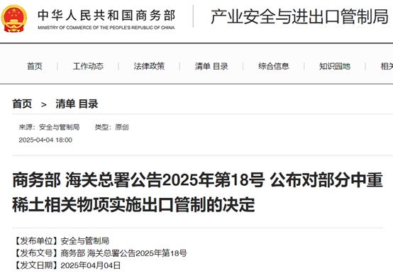 2025年4月4日,商务部、海关总署两部门发布2025年第18号公告,决定对部分中重稀土相关物项实施出口管制,全文如下:
