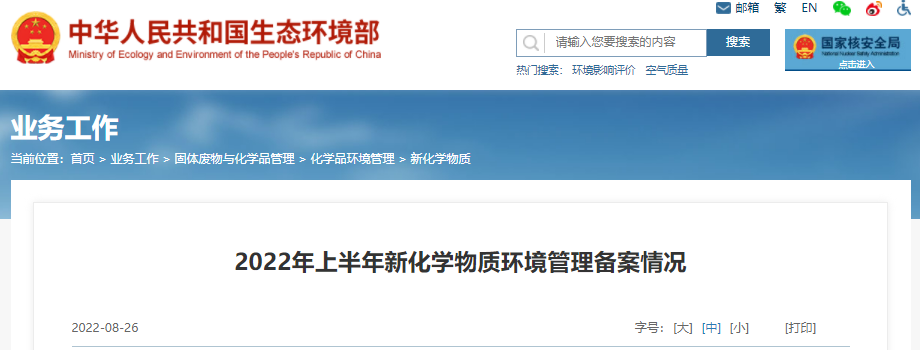 根据《新化学物质环境管理登记办法》(生态环境部令第12号)第三十七条规定,现将2022年1月至2022年6月期间新化学物质环境管理备案情况予以公布。详见附表。