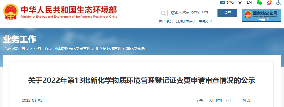 根据《办法》第三十条,现将拟批准的新化学物质环境管理登记证变更申请相关情况予以公示。