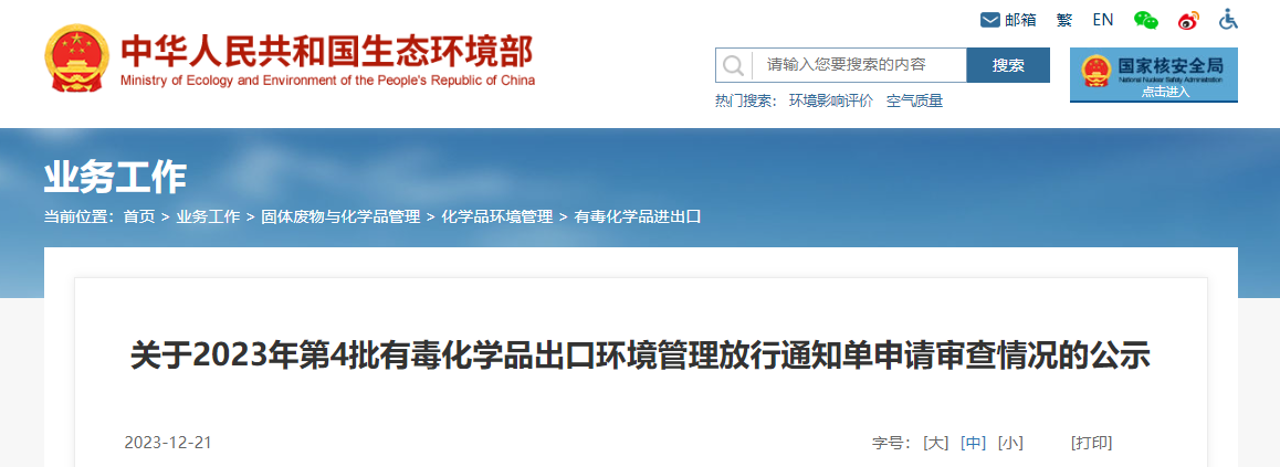 2023年12月21日,生态环境部发布了关于2023年第4批有毒化学品出口环境管理放行通知单申请审查情况的公示,具体内容如下: