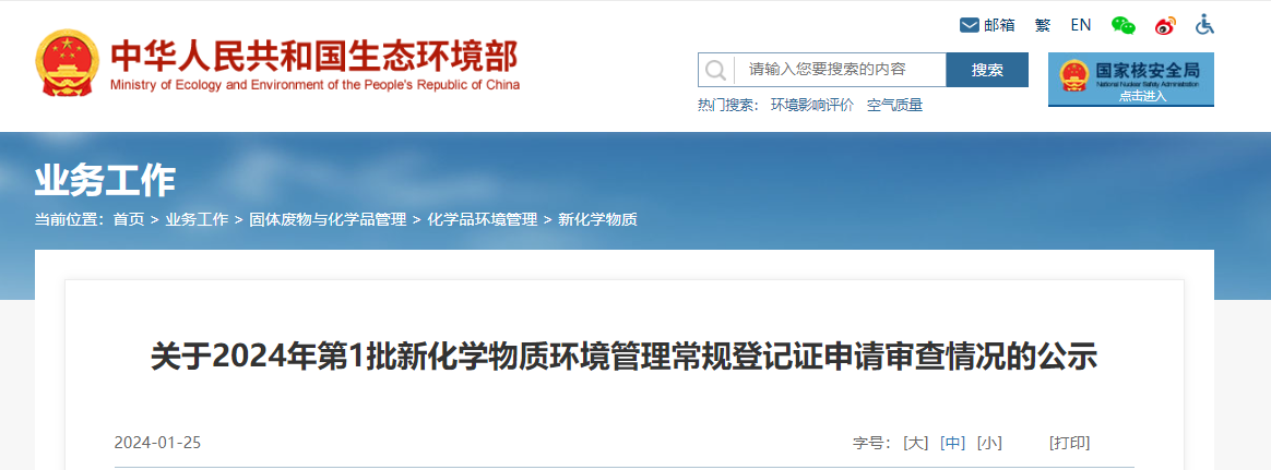 2024年1月25日,生态环境部发布了关于2024年第1批新化学物质环境管理常规登记证申请审查情况的公示,具体内容如下: