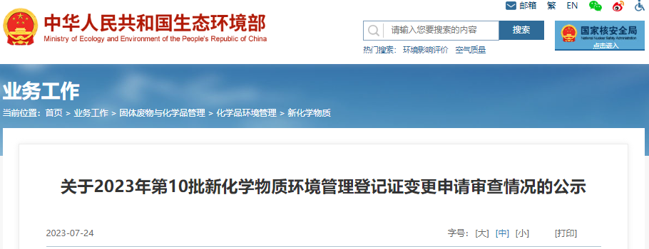 根据《办法》第三十条,现将拟批准的新化学物质环境管理登记证变更申请相关情况予以公示。